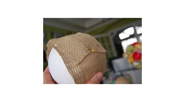 Encaixe as flores sobre a bola de isopor, podendo usar alfinetes como suporte.